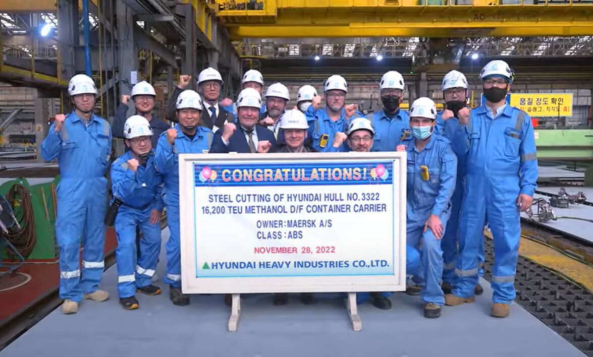 Fifteen months after ordering the first of its new 16,200 TEU containerships, which Maersk says will usher in a new era in ocean shipping, work began for the construction of the first of the ships. In addition to being the first large containerships designed to operate on methanol, they will also incorporate a range of features to improve operating efficiency and environmental performance. Maersk revealed in a video and social media posting that the ceremonial first steel cut for the new 16,200 TEU vessel took place in South Korea on November 28. The shipping company noted that “A good beginning is half way to completion.” The ships are being built by Hyundai Heavy Industries which previously valued the order at $1.4 billion. Delivery of the vessels is scheduled between the first and fourth quarters of 2024. Most of the details for the ships are yet to be revealed other than a length of 1,148 feet with a 175-foot beam.